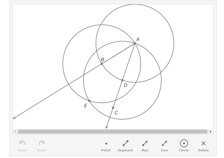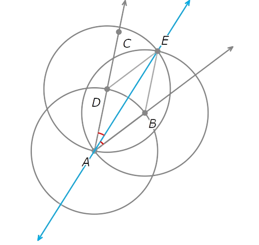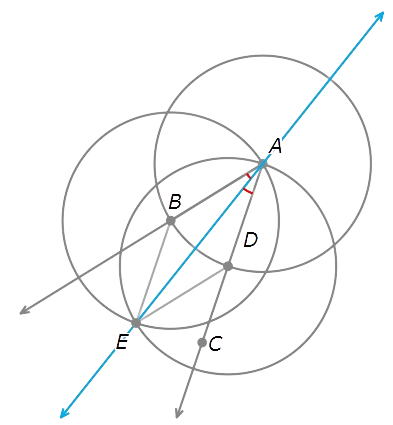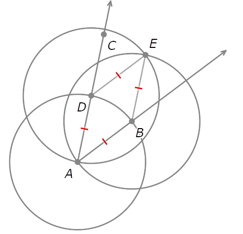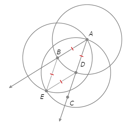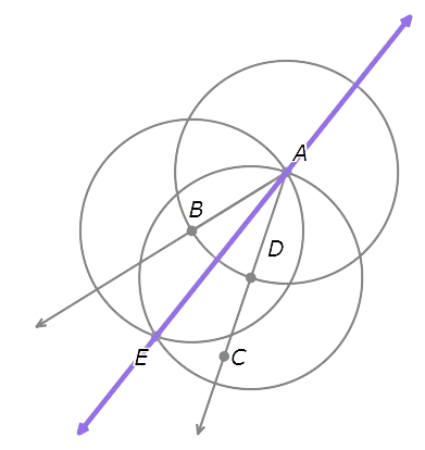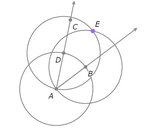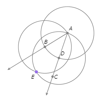 - Mark the point other than A where ⨀B and ⨀D intersect. Call it E.